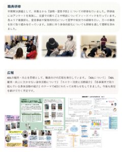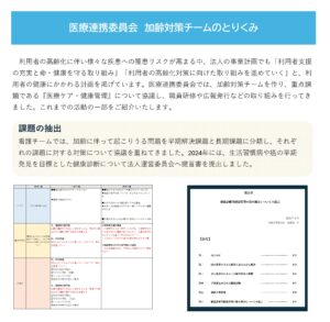利用者さんの加齢に伴い、さまざまなケアが必要になってきます。法人内に設置されている医療連携委員会では、加齢対策チームを作り、『医療ケア・健康管理』について協議し、職員研修や広報発行などの取り組みを行ってきました。これまでの活動の一部をご紹介いたします。