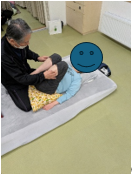 椅子の立ち上がり運動を参考に、「ボールをカゴに入れる」「ハイタッチ体操」を生活介護やグループホームで実施しています。また、行動援護の外出場面では、身体的に負荷がかからず、安全に運動ができる場所を探索し、AEONにあるイオンモールウォーキングを目安にご本人にも負担なくできる簡単なウォーキングにアレンジし実践しています。